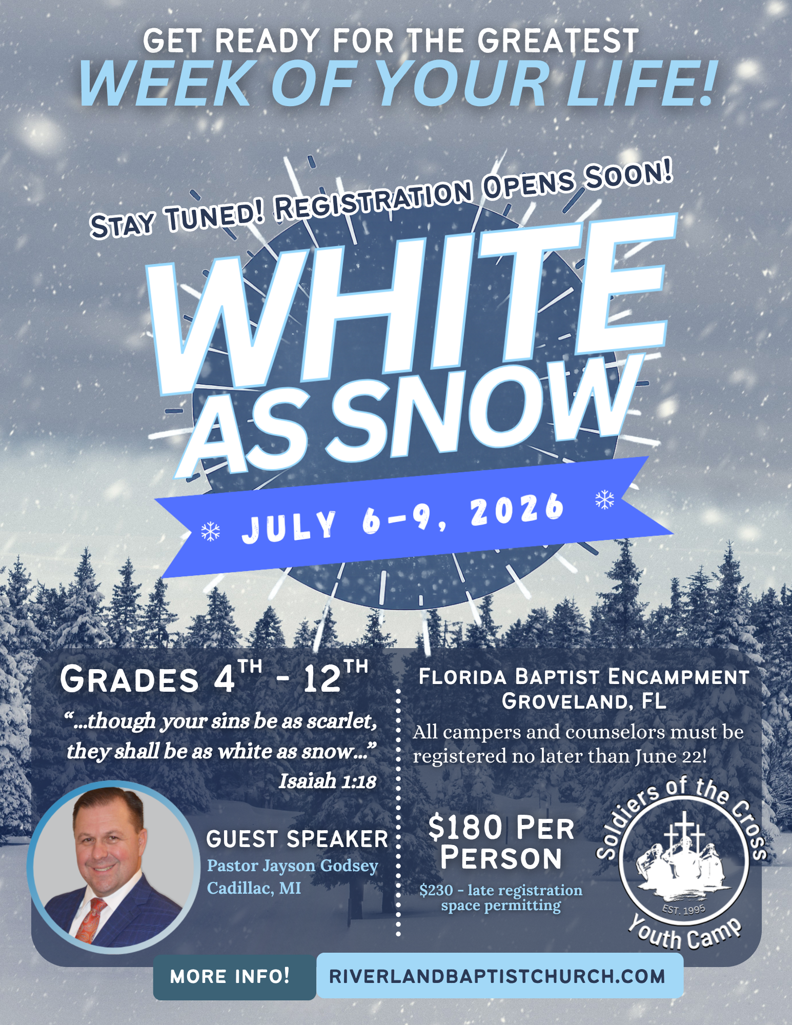 Soldiers of the Cross Youth Camp has been impacting countless young lives across Central Florida since 1995. SOTCYC has provided an action-packed week of solid Bible preaching, Godly music, fun games and activities, and much more - all for the opportunity to change a life for Christ.